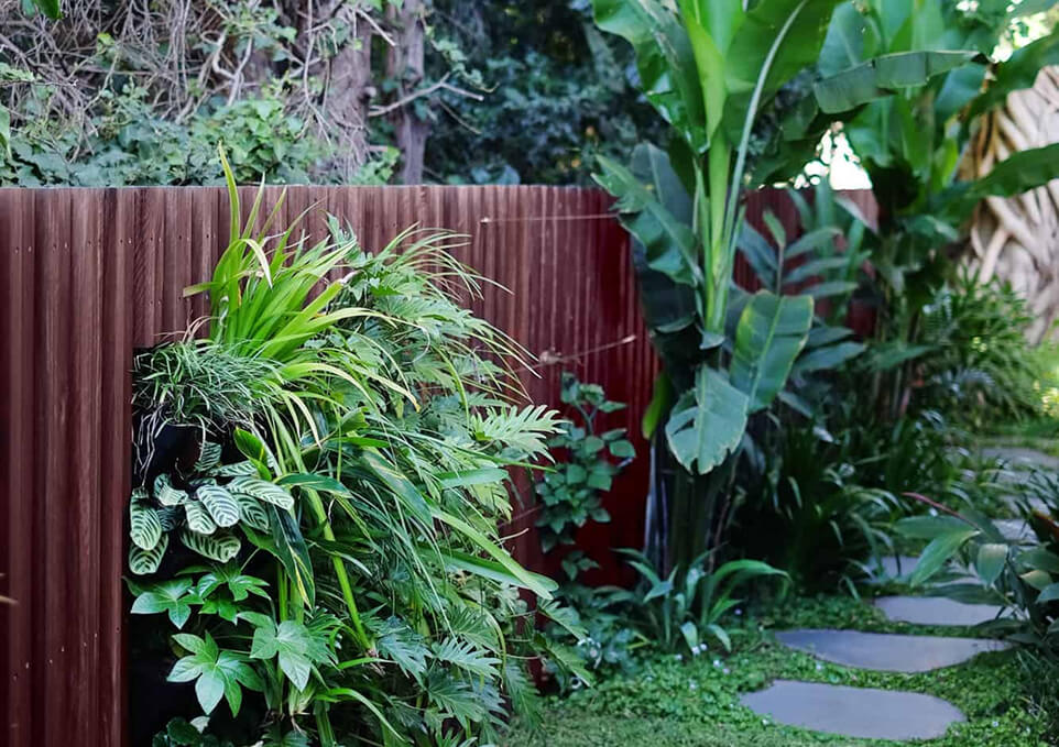 The design focused on lush tropical planting, with species like Strelitzia, ferns, and other broad-leaf plants to create a rich, green oasis. Vertical gardens were incorporated to add texture and depth. Meandering pathways were designed to invite exploration, all set against the darker tones of bluestone and stained timber. These elements, combined with the glossy greenery, created a stunning contrast to the home’s bright interiors and all-white façade.