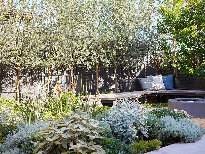 The design embraced free-flowing garden beds with an eclectic mix of coastal plants. Curved custom bench seating made from Cumaru was positioned to maximise the afternoon sun, offering a perfect spot for relaxation. To enhance the “Australian Cottage” feel, we used crushed granite to soften the hardscape, complemented by a variety of hardy plants like Olive Trees, Blue Chalk Sticks, and Cotton Lavender. The colours and textures in the plant palette were chosen to evoke calm, with blue and grey hues featured throughout.